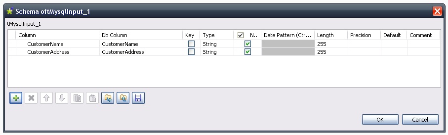 | In the scope of this use case, it is assumed there is a database formationtalend on the localhost, having a table named customers. The schema of the customers table includes two columns named CustomerName and CustomerAddress, both being of type varchar(255). |