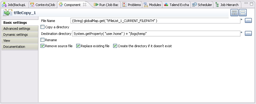 - Eventually, a second tFileCopy is in charge of copying the log into the backup directory. The original file is deleted.