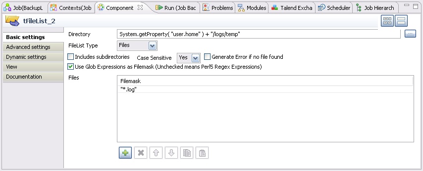 - The tFileList components gets all the *.log files from the directory System.getProperty( "user.home" ) + "/logs"