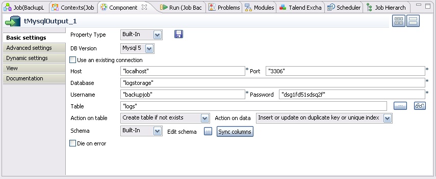 - The tMysqlOutput component receives the content from a log file and sends it into the table logs from the logstorage database.