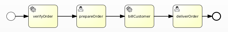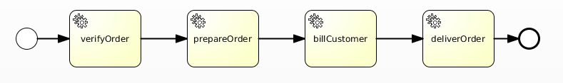 Integration modeThe mode "Integration" of the SE Flowable permits to interact directly with the BPMN 2.0 engine (Flowable) through a service-based API. Several services are provided by the component to interact directly with the BPMN 2.0 engine. This mode is activated at the component level. Concurrency Several instance of the component can be deployed concurrently on Petals ESB. A sequence of service-based API invocations can be exploded on each component instances Service modeThe mode "Service" of the SE Flowable permits to implement your services using orchestration and/or process capabilities of BPMN 2.0. This mode is available through the deployment of a service unit including the process definition. Orchestration An orchestration is sequence of automatic service invocations, and can be modeled as a sequence of service tasks in a BPMN2 description. Creating an instance of such a process will start automatically the sequence of service invocations. With BPMN2 it is possible to implement your orchestration as a process containing only service tasks. For example, the following orchestration can be an implementation of a service processing a "New Order": Process A process or workflow can be "servicized" at different levels: