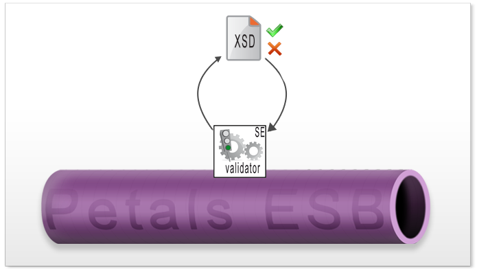 FeaturesThe Validation Service-Engine allows to validate and filter Petals messages against an XML Schema. Each configuration of this component embeds an XML Schema (made up of one or several XSD files). This component only acts as service provider, not as a service consumer. Validation Component overview
