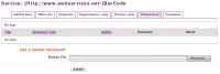 In this tab you could also manage service related WSDLs (automatically linked when you create a service from a wsdl import or added after service manual creation). If you want to see a WSDL click on the links of the download column. You could also delete them by clicking on the delete button. Deleted WSDL will only be unlinked from the service (if not linked to other services or endpoints, it is totally removed from the registry). If you want to add a new WSDL description to the current service, just click on the Add button of the Service Specification table, a new page appears.