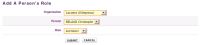 To add a person's role, it is very simple. Click on the 'Create person's role' button, then fill in the form : choose an organization, choose a person, then choose a role and validate.