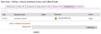 In this tab you could also manage service related WSDLs (automatically linked when you create a service from a wsdl import or added after service manual creation). If you want to see a WSDL click on the links of the download column. You could also delete them by clicking on the delete button. Deleted WSDL will only be unlinked from the service (if not linked to other services or endpoints, it is totally removed from the registry). If you want to add a new WSDL description to the current service, just click on the Add button of the Service Specification table, a new page appears.