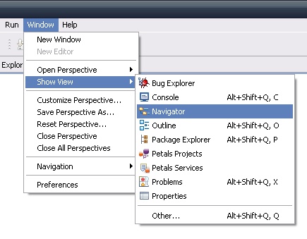 - The superior left part contains two views: the Petals Projects view and the (Java) Package Explorer.