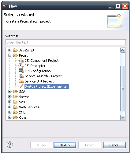 Sketch projects are created using the Petals Sketch wizard (File > New > Petals > Sketch project).