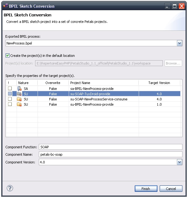 Such a project can then be transformed into a set of concrete Petals projects, updating if necessary the SCA or BPEL artifacts to make them run in Petals.