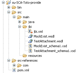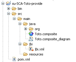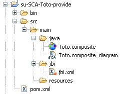 By selecting Implement a native Petals service with SCA, the resulting project will contain a basic SCA application, with a component, a promoted service, an interface on the service and a component implementation. Both (and only) the Java interface and the Java implementation will need to be completed. The composite does not require any change.