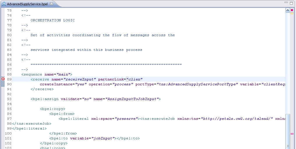 BPEL XML schemas have been registered in the XML catalog, so that contextual help (Ctrl + L) can propose mark-ups and attributes to insert.