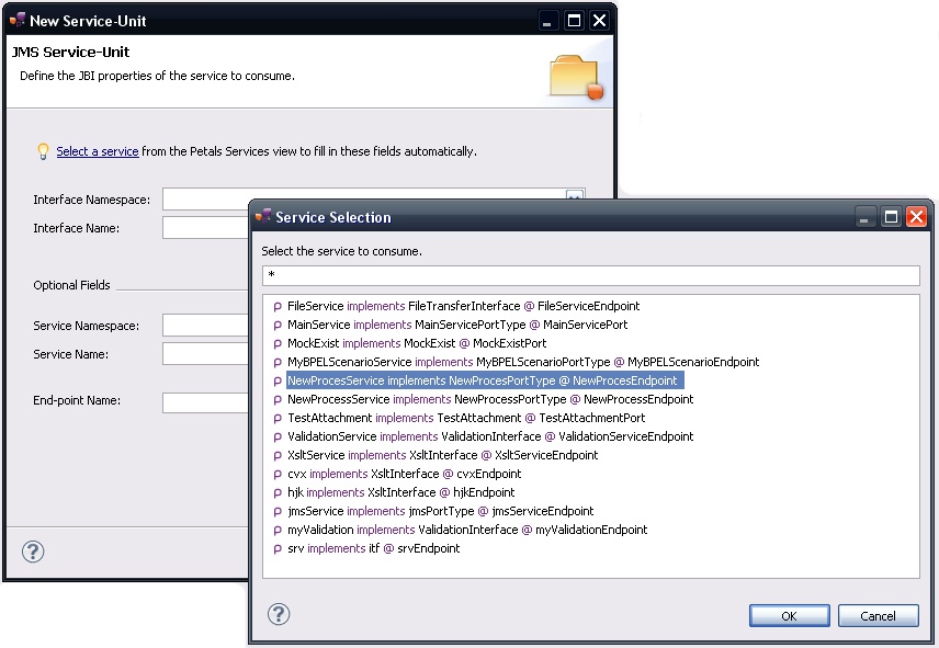 | The values for the interface, service and end-point names must match the values defined in the jbi.xml of the invoked service. Indeed, this service must be a Petals service, and thus be described in a jbi.xml. As a reminder, the jbi.xml values and the WSDL values (if the WSDL exists) of the invoked service must be exactly the same. For this reason, filling-in the information by hand or modifying it is discouraged. |