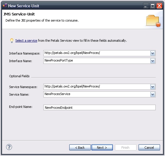 In the Petals Component list, select JMS // petals-bc-jms.