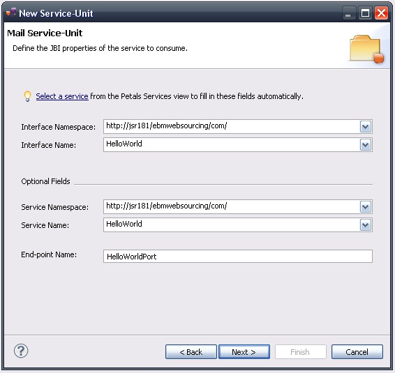 The current page requires you to fill-in the base information to put in the JBI descriptor (META-INF/jbi.xml).
