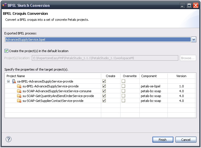 Such a project can then be transformed into a set of concrete Petals projects, updating if necessary the BPEL artifacts to make them run in Petals.