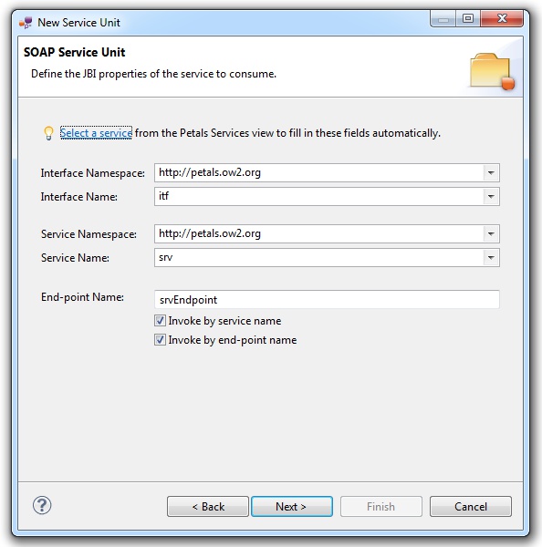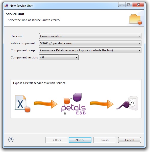 In the Petals Component list, select SOAP // petals-bc-soap.