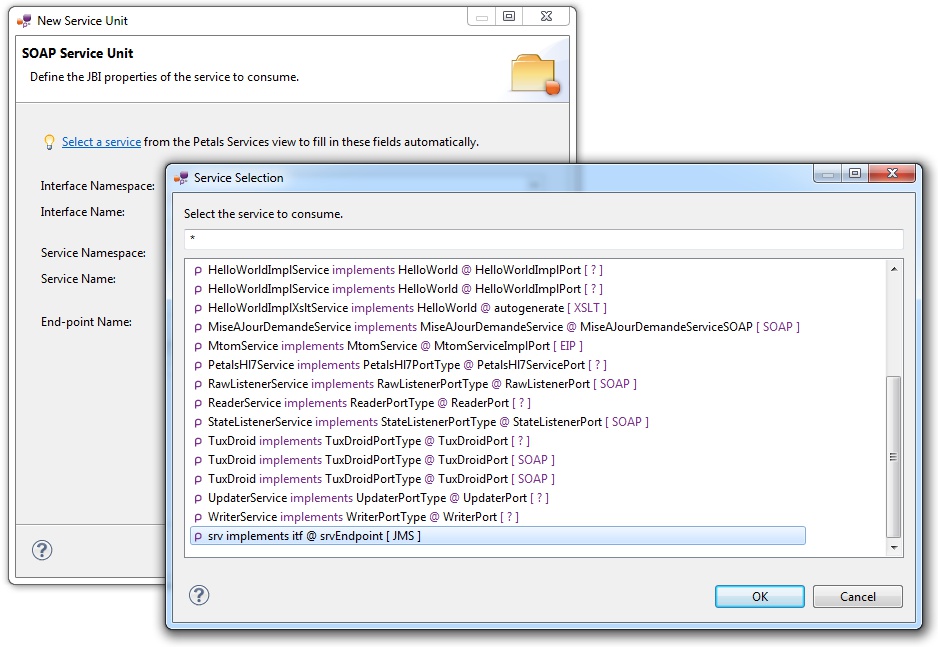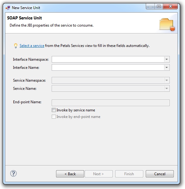 | The values for the interface, service and end-point names must match the values defined in the jbi.xml of the exposed service. Indeed, this service must be a Petals service, and thus be described in a jbi.xml. As a reminder, the jbi.xml values and the WSDL values (if the WSDL exists) of the exposed service must be exactly the same. For this reason, filling-in the information by hand or modifying it is discouraged. |