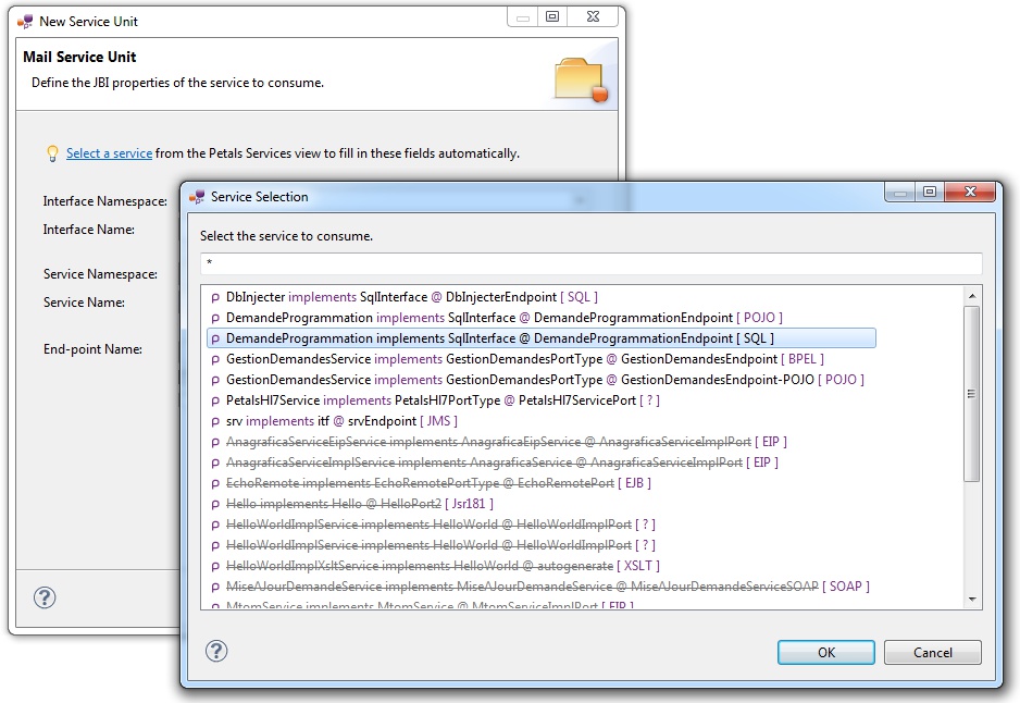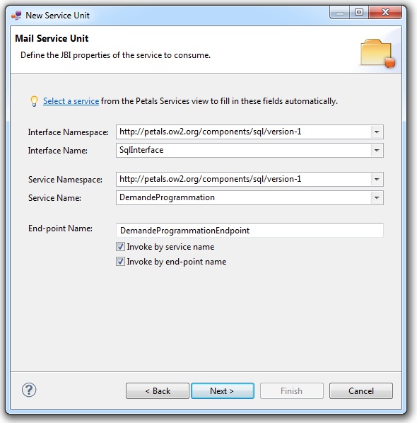 | The values for the interface, service and end-point names must match the values defined in the jbi.xml of the invoked service. Indeed, this service must be a Petals service, and thus be described in a jbi.xml. As a reminder, the jbi.xml values and the WSDL values (if the WSDL exists) of the invoked service must be exactly the same. For this reason, filling-in the information by hand or modifying it is discouraged. |