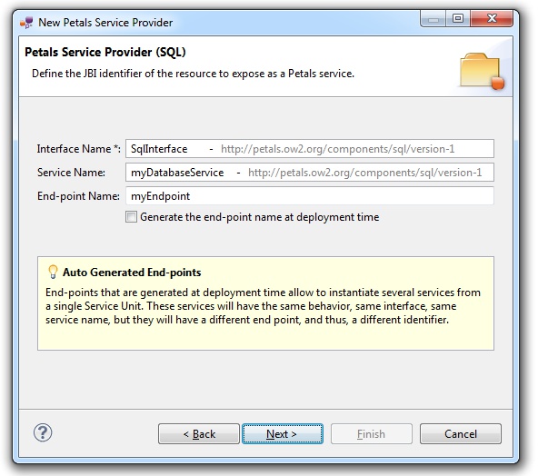 | The auto-generation of the end-point means the service end-point is generated at deployment time. By deploying a such service-unit on n Petals nodes, you would have n times the same service, implementing the same interface, but available at n different locations. |
