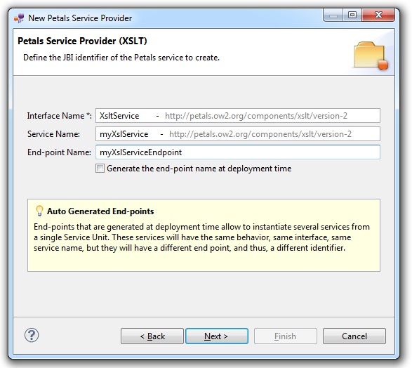 | The auto-generation of the end-point means the service end-point is generated at deployment time. By deploying a such service-unit on n Petals nodes, you would have n times the same service, implementing the same interface, but available at n different locations. |