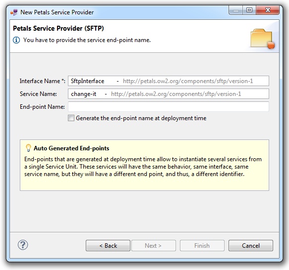 | The auto-generation of the end-point means the service end-point is generated at deployment time. By deploying a such service-unit on n Petals nodes, you would have n times the same service, implementing the same interface, but available at n different locations. |