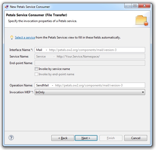 | The values for the interface, service and end-point names must match the values defined in the jbi.xml of the invoked service. Indeed, this service must be a Petals service, and thus be described in a jbi.xml. As a reminder, the jbi.xml values and the WSDL values (if the WSDL exists) of the invoked service must be exactly the same. For this reason, filling-in the information by hand or modifying it is discouraged. |
