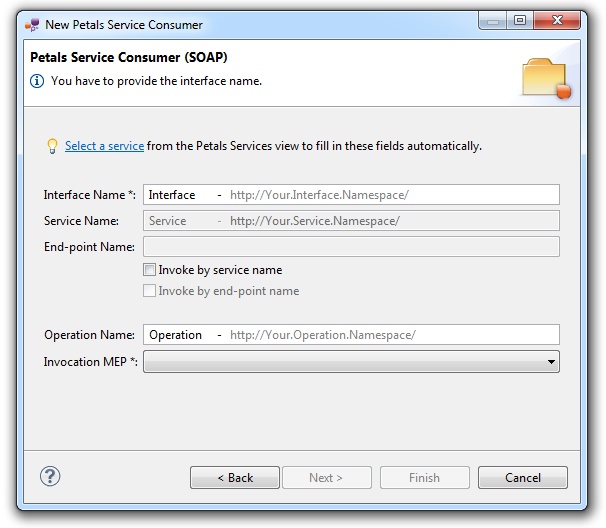 | The values for the interface, service and end-point names must match the values defined in the jbi.xml of the exposed service. Indeed, this service must be a Petals service, and thus be described in a jbi.xml. As a reminder, the jbi.xml values and the WSDL values (if the WSDL exists) of the exposed service must be exactly the same. For this reason, filling-in the information by hand or modifying it is discouraged. |