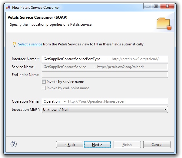 | A service is identified by a triplet, interface, service and end-point names. This triplet is unique in a Petals topology. When you consume a service, the service is selected in a set. This set is defined by the invocation properties. If the 3 fields are set in the consume properties, then the set will contain at most 1 result (there can be only 1 service with this ID). Consume possibilities are the following ones: