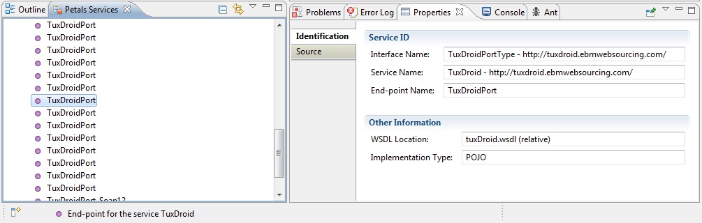 For a given source, the view lists all the Petals services as a triplet ( interface, service, end-point ).
