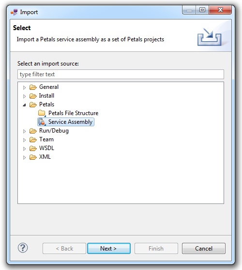 To import a service assembly into your work space, click File > Import > Petals > Service Assembly.