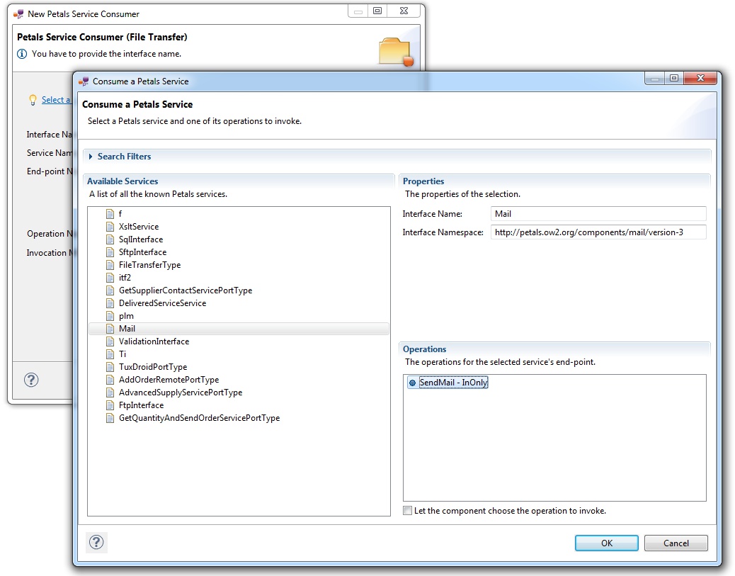 | The values for the interface, service and end-point names must match the values defined in the jbi.xml of the invoked service. Indeed, this service must be a Petals service, and thus be described in a jbi.xml. As a reminder, the jbi.xml values and the WSDL values (if the WSDL exists) of the invoked service must be exactly the same. For this reason, filling-in the information by hand or modifying it is discouraged. |