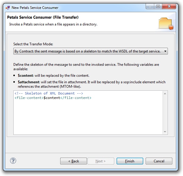 - And the last one is a new mode, more compatible with the SOA paradigm than the 2 previous ones. This last mode expects a message skeleton to be defined. Variables can be used to either put the file as attachment, or to insert the file content in the XML message. This approach allows to send messages that respect the service contract (WSDL) of the target service.