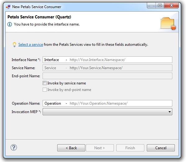 | The values for the interface, service and end-point names must match the values defined in the jbi.xml of the invoked service. Indeed, this service must be a Petals service, and thus be described in a jbi.xml. As a reminder, the jbi.xml values and the WSDL values (if the WSDL exists) of the invoked service must be exactly the same. For this reason, filling-in the information by hand or modifying it is discouraged. |