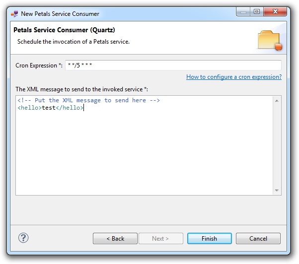 | The current tooling is very basic for this component. There is neither an editor for CRON expressions, nor generation facilities for the XML message. |