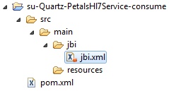 <?xml version="1.0" encoding="UTF-8"?> <!-- JBI descriptor for the Petals' "petals-se-quartz" component (Quartz). Originally created for the version 1.1 of the component. --> <jbi:jbi version="1.0" xmlns:generatedNs="http://petals.ow2.org/components/hl7/version-1" xmlns:jbi="http://java.sun.com/xml/ns/jbi" xmlns:petalsCDK="http://petals.ow2.org/components/extensions/version-5" xmlns:quartz="http://petals.ow2.org/components/quartz/version-1" xmlns:xsi="http://www.w3.org/2001/XMLSchema-instance"> <!-- Import a Service into Petals or Expose a Petals Service => use a BC. --> <jbi:services binding-component="false"> <!-- Expose a Petals Service => consumes a Service. --> <jbi:consumes interface-name="generatedNs:PetalsHl7PortType" service-name="generatedNs:PetalsHl7Service" endpoint-name="PetalsHl7ServicePort"> <!-- CDK specific elements --> <petalsCDK:timeout>30000</petalsCDK:timeout> <petalsCDK:operation xmlns:sendInOnlyNs="http://petals.ow2.org/components/hl7/version-1">sendInOnlyNs:sendInOnly</petalsCDK:operation> <petalsCDK:mep>InOnly</petalsCDK:mep> <!-- Component specific elements --> <quartz:cron-expression>0 0 12 * * ? </quartz:cron-expression> <quartz:content><![CDATA[<!-- Put the XML message to send here --> <text>hello</text>]]></quartz:content> </jbi:consumes> </jbi:services> </jbi:jbi>